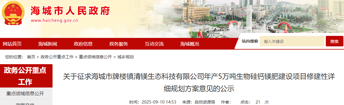 為切實(shí)增強(qiáng)規(guī)劃的科學(xué)性、合理性和可行性,征求公眾意見,根據(jù)《中華人民共和國城鄉(xiāng)規(guī)劃法》第二十六條規(guī)定,現(xiàn)將海城市牌樓鎮(zhèn)清鎂生態(tài)科技有限公司年產(chǎn)5萬噸生物硅鈣鎂肥建設(shè)項(xiàng)目修建性詳細(xì)規(guī)劃方案內(nèi)容公告如下: