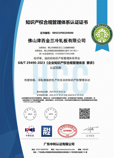 近日,津西金蘭成功通過《企業(yè)知識(shí)產(chǎn)權(quán)合規(guī)管理體系要求》(GB/T 29490-2023)認(rèn)證并獲得認(rèn)證證書。這標(biāo)志著津西金蘭在知識(shí)產(chǎn)權(quán)創(chuàng)造、運(yùn)用、保護(hù)及管理領(lǐng)域邁上了規(guī)范化、標(biāo)準(zhǔn)化、系統(tǒng)化的新階段,為公司持續(xù)提升創(chuàng)新能力和核心競(jìng)爭(zhēng)力奠定堅(jiān)實(shí)基礎(chǔ)。