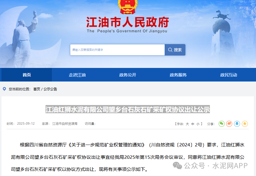 9月12日,四川省江油市人民政府發(fā)布“江油紅獅水泥有限公司望鄉(xiāng)臺石灰石礦采礦權協(xié)議出讓公示”。