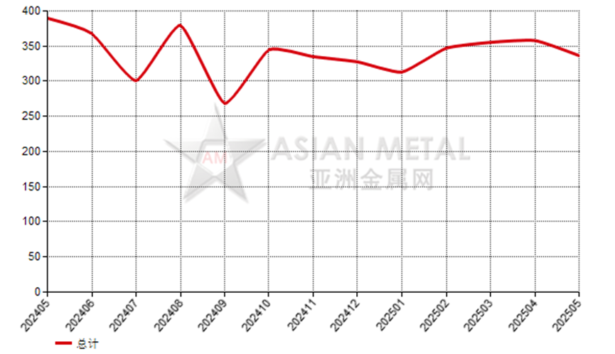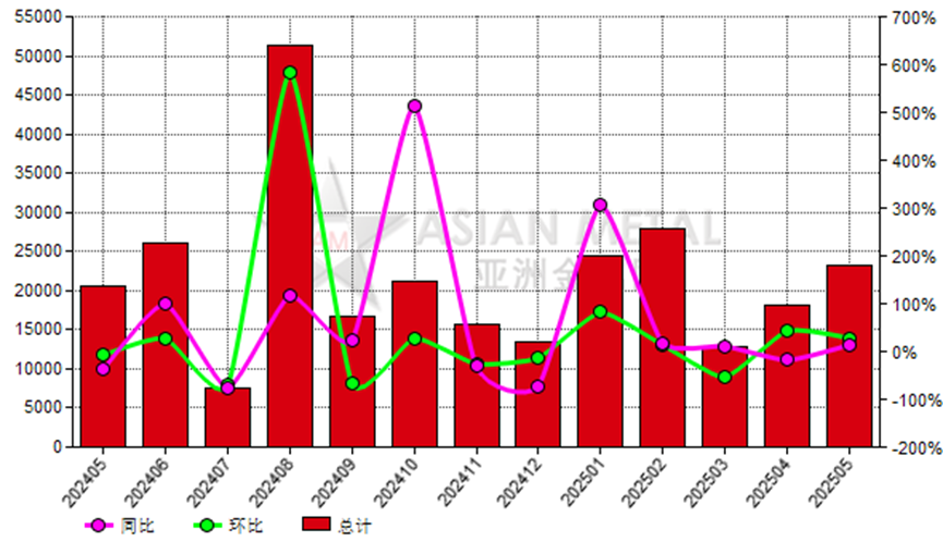 2025年5月份巴西鎂砂出口量23,303.34公噸,去年同期為20,599.73公噸,上月為18,176.40公噸,同比上漲13.12%,環(huán)比上漲28.21%。