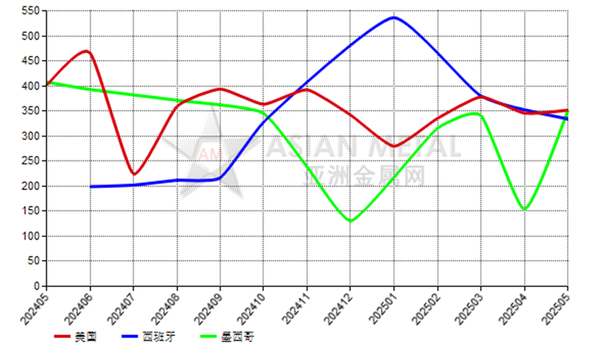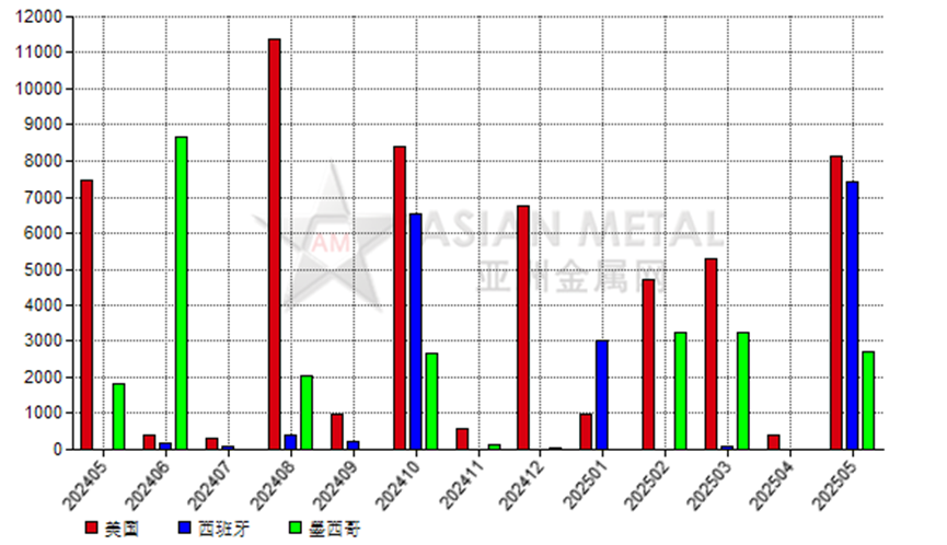 2025年5月,巴西鎂砂前三大出口目的國為美國、西班牙和墨西哥。
