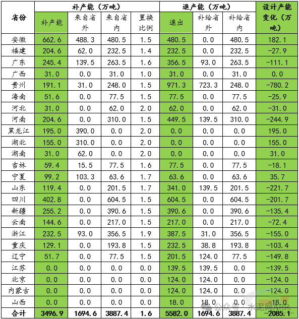 據(jù)中國水泥網(wǎng)水泥大數(shù)據(jù)研究院統(tǒng)計(jì),截至當(dāng)前,補(bǔ)產(chǎn)能公示項(xiàng)目?jī)H100余例,累計(jì)補(bǔ)充產(chǎn)能3496.9萬噸,退出5582萬噸,凈減2085.1萬噸,凈減產(chǎn)能數(shù)量遠(yuǎn)少于需求下滑數(shù)量,供需矛盾放大,政策效果較差。
