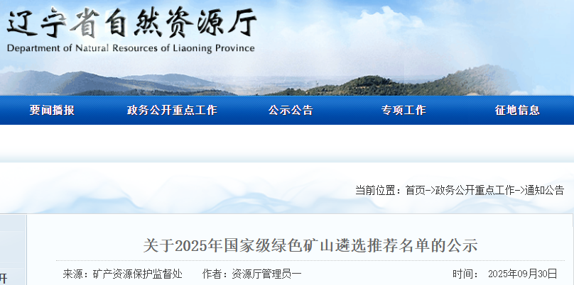 按照《關(guān)于進(jìn)一步加強(qiáng)綠色礦山建設(shè)的通知》(自然資規(guī)〔2024〕1號(hào))和《自然資源部辦公廳關(guān)于開展新一批國家級(jí)綠色礦山遴選工作的通知》(自然資辦發(fā)〔2025〕8號(hào))相關(guān)要求,遼寧省自然資源廳嚴(yán)格組織開展國家級(jí)綠色礦山遴選推薦工作。經(jīng)企業(yè)自主申報(bào)、省廳綜合評(píng)審,現(xiàn)擇優(yōu)確定5家企業(yè)作為2025年國家級(jí)綠色礦山遴選推薦對(duì)象,具體名單詳見附件。