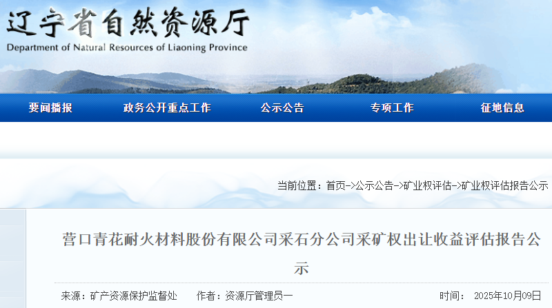 營(yíng)口青花耐火材料股份有限公司采石分公司采礦權(quán)出讓收益評(píng)估報(bào)告通過(guò)遼寧省自然資源廳門(mén)戶(hù)網(wǎng)站向社會(huì)公示,公示10個(gè)工作日。如有異議,請(qǐng)于公示之日起10個(gè)工作日內(nèi)以電話方式先向省自然資源廳礦產(chǎn)資源保護(hù)監(jiān)督處提出簡(jiǎn)要意見(jiàn),隨后及時(shí)將書(shū)面意見(jiàn)反饋到省自然資源廳礦產(chǎn)資源保護(hù)監(jiān)督處。