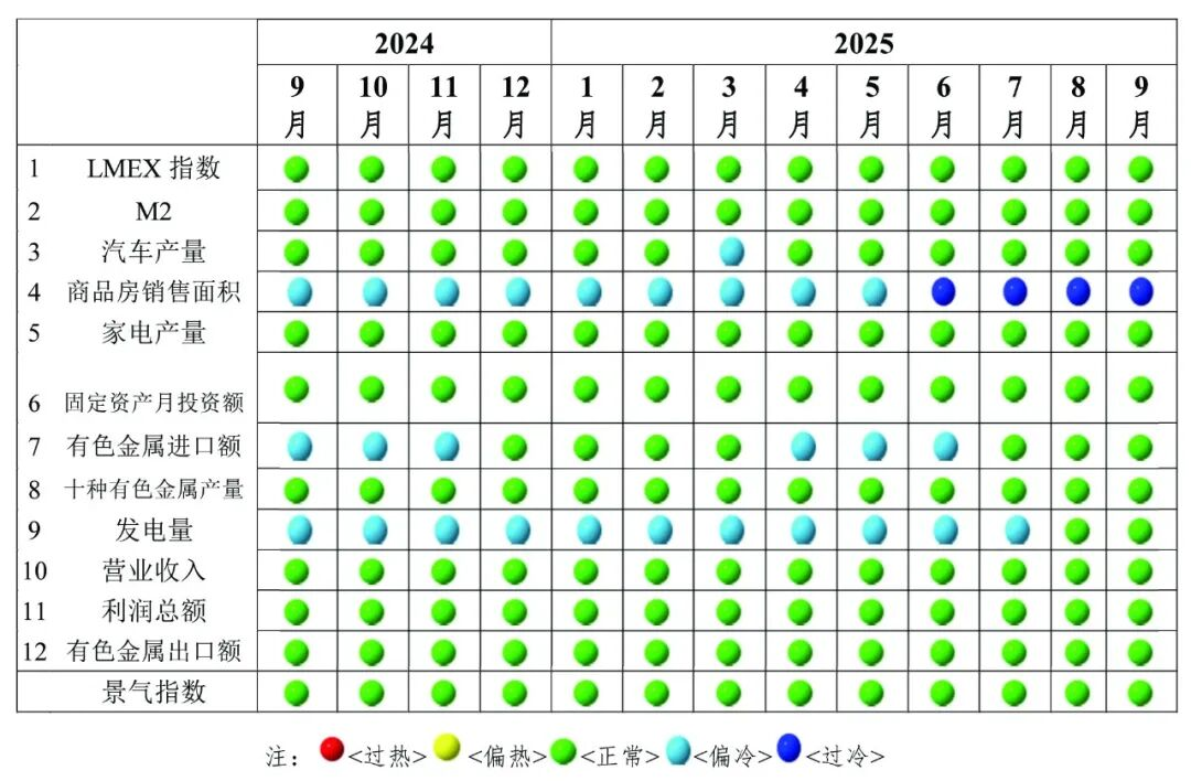在構成有色金屬產(chǎn)業(yè)景氣指數(shù)的12項指標中,LMEX指數(shù)、M2、汽車產(chǎn)量、家電產(chǎn)量、有色金屬固定資產(chǎn)月投資額、有色金屬進口額、十種有色金屬產(chǎn)量、發(fā)電量、營業(yè)收入、利潤總額及有色金屬出口額等11項指標位于“正?!眳^(qū)間,僅商品房銷售面積1項指標位于“過冷”區(qū)間。