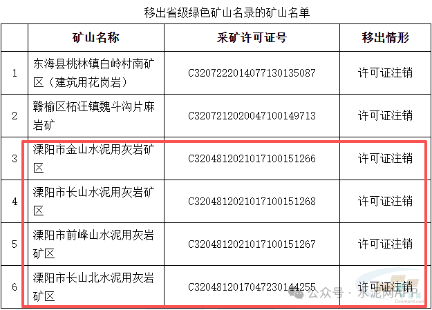 分別為溧陽(yáng)市金山水泥用灰?guī)r礦區(qū)、溧陽(yáng)市長(zhǎng)山水泥用灰?guī)r礦區(qū)、溧陽(yáng)市前峰山水泥用灰?guī)r礦區(qū)、溧陽(yáng)市長(zhǎng)山北水泥用灰?guī)r礦區(qū)。移出情形均為許可證注銷(xiāo)。