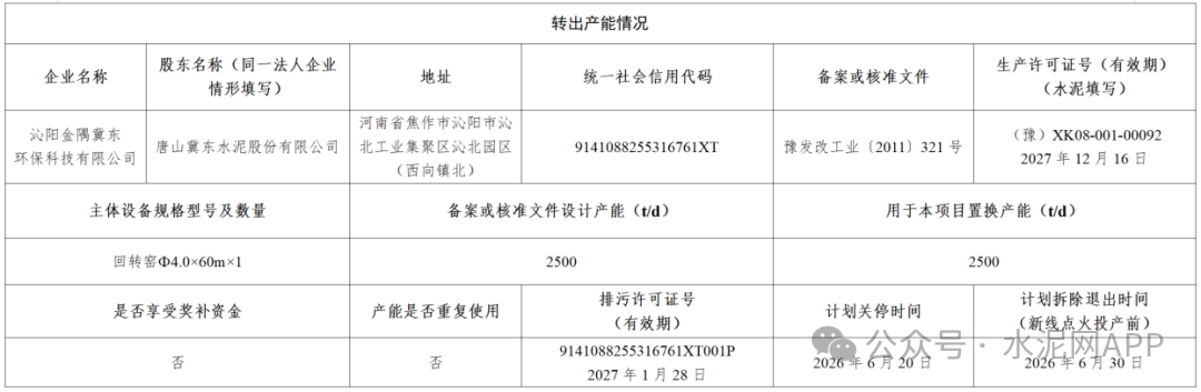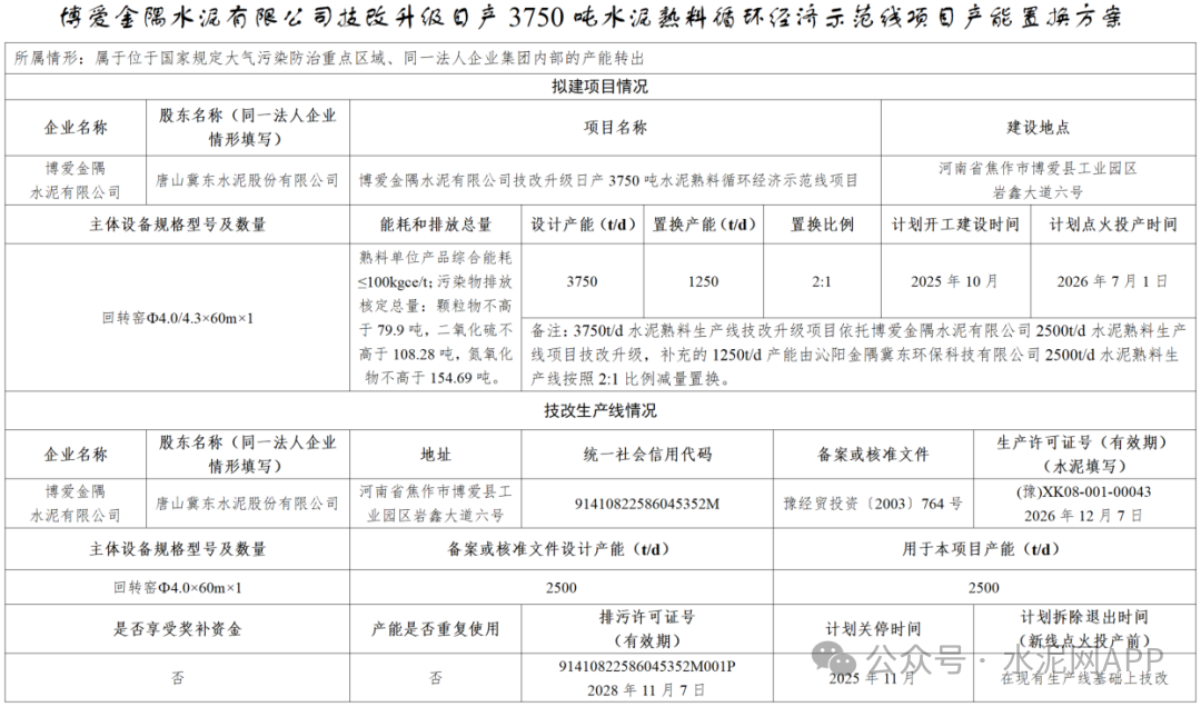 置換方案顯示,博愛金隅3750t/d水泥熟料生產(chǎn)線技改升級項目依托博愛金隅水泥有限公司2500t/d水泥熟料生產(chǎn)線項目技改升級,補(bǔ)充的1250t/d產(chǎn)能由沁陽金隅冀東環(huán)??萍加邢薰?500t/d水泥熟料生產(chǎn)線按照2:1比例減量置換。