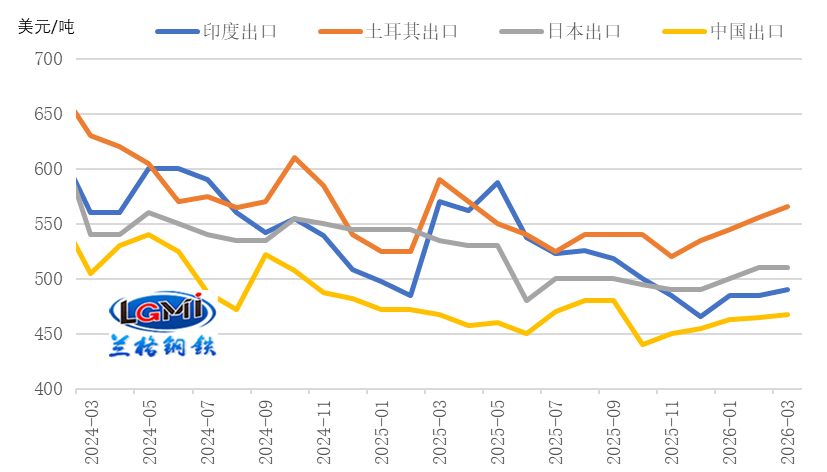 盡管出口面臨多重壓力,我國鋼材的國際價格競爭力并未減弱。近期國內(nèi)出口報價小幅上調(diào),主要出口國報價亦同步上行,我國鋼材仍保持明顯價差優(yōu)勢。據(jù)蘭格鋼鐵研究中心監(jiān)測數(shù)據(jù),截至2026年3月10日,中國熱軋卷板出口報價(FOB)為467美元/噸,顯著低于印度(490美元/噸)、日本(510美元/噸)和土耳其(566美元/噸)等主要競爭對手,價差分別達23美元/噸、43美元/噸和99美元/噸,強勁的價格優(yōu)勢為出口規(guī)模提供堅實支撐(詳見圖2)。