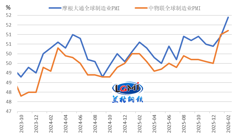 全球制造業(yè)雖處于擴張區(qū)間,但復(fù)蘇動能不足,對鋼材外需拉動有限。2026年2月,中國物流與采購聯(lián)合會全球制造業(yè)PMI為51.2%,環(huán)比提升0.2個百分點;摩根大通全球制造業(yè)PMI為51.9%,環(huán)比回升1.0個百分點(詳見圖4)。兩大指數(shù)雖位于榮枯線以上,但復(fù)蘇基礎(chǔ)薄弱,外需整體景氣度偏低,難以對我國出口形成強勁拉動。