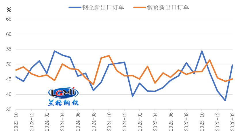 2026年2月,鋼鐵行業(yè)新出口訂單指數(shù)觸底回升,雖仍處于榮枯線以下,但釋放積極信號。其中,中物聯(lián)鋼鐵物流專委會鋼鐵企業(yè)新出口訂單指數(shù)為49.7%,環(huán)比大幅回升11.8個百分點;中金協(xié)&蘭格鋼鐵網(wǎng)鋼鐵流通企業(yè)新出口訂單指數(shù)為45.1%,環(huán)比回升0.8個百分點(詳見圖5)。