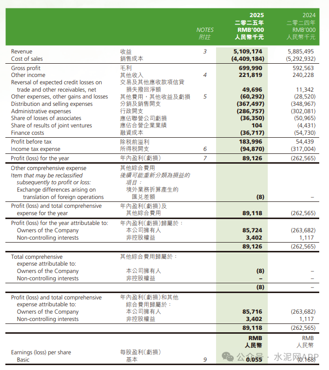 3月9日晚間,亞洲水泥(中國(guó))發(fā)布截至2025年12月31日止年度業(yè)績(jī),該集團(tuán)取得收益51.09億元,同比減少13.19%;公司擁有人應(yīng)占盈利(歸母凈利潤(rùn))8572.4萬元,2024年同期虧損2.64億元。公告稱,收益減少主要由于本集團(tuán)產(chǎn)品銷量及平均售價(jià)于2025年下降所致。