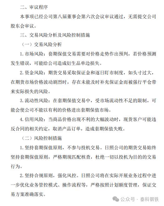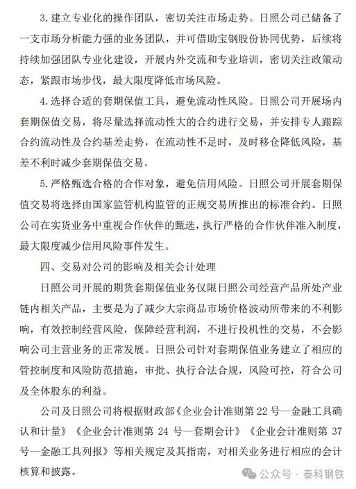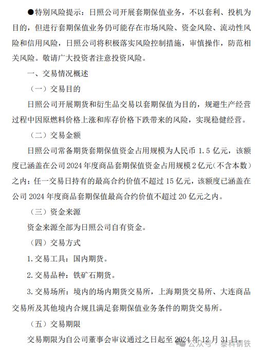 公告披露,山鋼日照常備期貨套期保值資金占用規(guī)模為1.5億元,該額度已涵蓋在該公司2024年度商品套期保值資金占用規(guī)模2億元(不含本數(shù))之內(nèi);任一交易日持有的最高合約價值不超過15億元,該額度已涵蓋在該公司2024年度商品套期保值最高合約價值不超過20億元之內(nèi)。該公司擬開展商品類金融衍生品業(yè)務(wù)的品種為鐵礦石期貨,期貨交易以套期保值為目的,規(guī)避生產(chǎn)經(jīng)營過程中因原燃料價格上漲和庫存價格下跌帶來的風(fēng)險,實現(xiàn)穩(wěn)健經(jīng)營。
