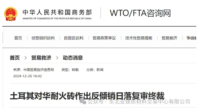 2024年12月20日,土耳其貿(mào)易部發(fā)布第2024/36號公告,對原產(chǎn)于中國的鉻鐵礦、菱鎂礦和鉻菱鎂礦耐火磚(土耳其語:kromit ate? tu?lalar, magnezit ate? tu?lalar, krom magnezit ate? tu?lalar, magnezit, dolomit veya kromit i?erenler (dolomit i?erenler hari?; magnezyum oksit esasl?, 3 mm ile 30mm aras? kal?nl?klarda yap? levhalar? hari?)作出反傾銷第三次日落復(fù)審肯定性終裁,決定維持2018年9月5日第2018/28號公告確定的反傾銷稅不變,繼續(xù)對涉案產(chǎn)品征收200美元/噸的反傾銷稅。本案涉及土耳其稅號6902.10.00.10.11、6902.10.00.10.12、6902.10.00.10.13和6815.91項(xiàng)下的產(chǎn)品,但不包括厚度在3毫米至30毫米之間的氧化鎂建筑板。措施自公告發(fā)布之日起生效,有效期為五年。