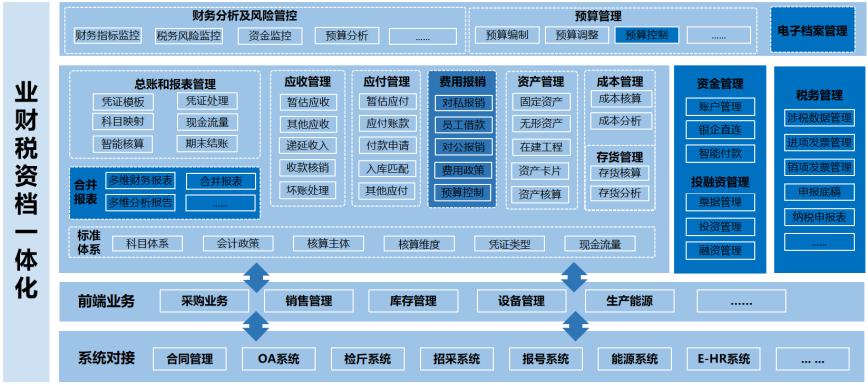 本次項目建設(shè)以促進業(yè)財深度融合、打通內(nèi)外部系統(tǒng)連接、提升數(shù)字化率、減少數(shù)據(jù)落地為目標,實現(xiàn)業(yè)、財、稅、資、檔一體化管理。系統(tǒng)包括總賬、資金、稅務(wù)、預算、費用報銷、成本、電子會計檔案、購銷、庫存等近30個模塊應(yīng)用,同時配套開展檢斤系統(tǒng)、報號系統(tǒng)、云招采、合同管理、設(shè)備管理系統(tǒng)、E-HR、OA、MES、能源系統(tǒng)等升級及對接。實現(xiàn)與集團統(tǒng)一平臺、對標補齊的同時,打造資金、稅務(wù)、預算、費用報銷等集團標桿試點應(yīng)用。